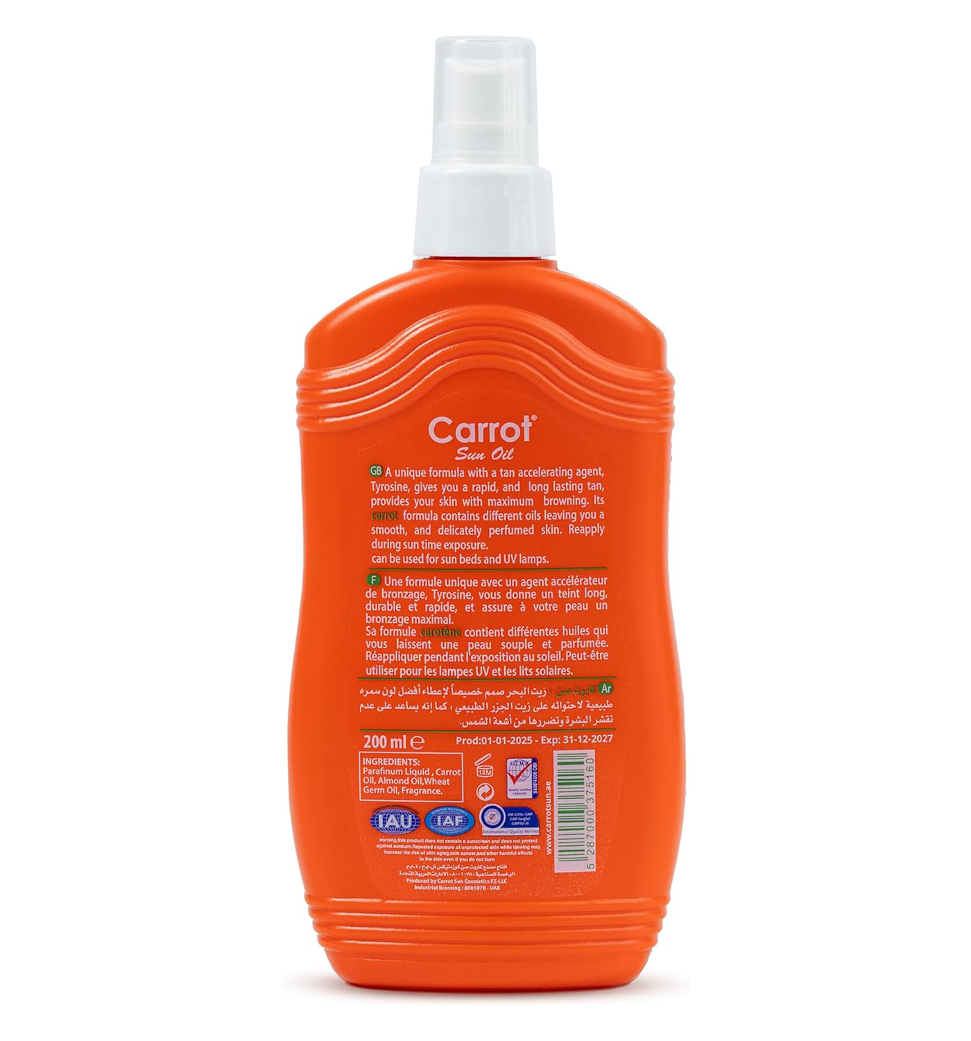 Carrot Sun Tanning Oil 200ml is a lightweight and non-greasy balm that promotes deep tanning in less time. It is formulated with L-tyrosine, which stimulates melanin production to help you get a deep tan over time. Carrot oil is another skin-loving ingredient in this tanning formula. It is rich in beta-carotene, which gives bronze and golden skin tints.