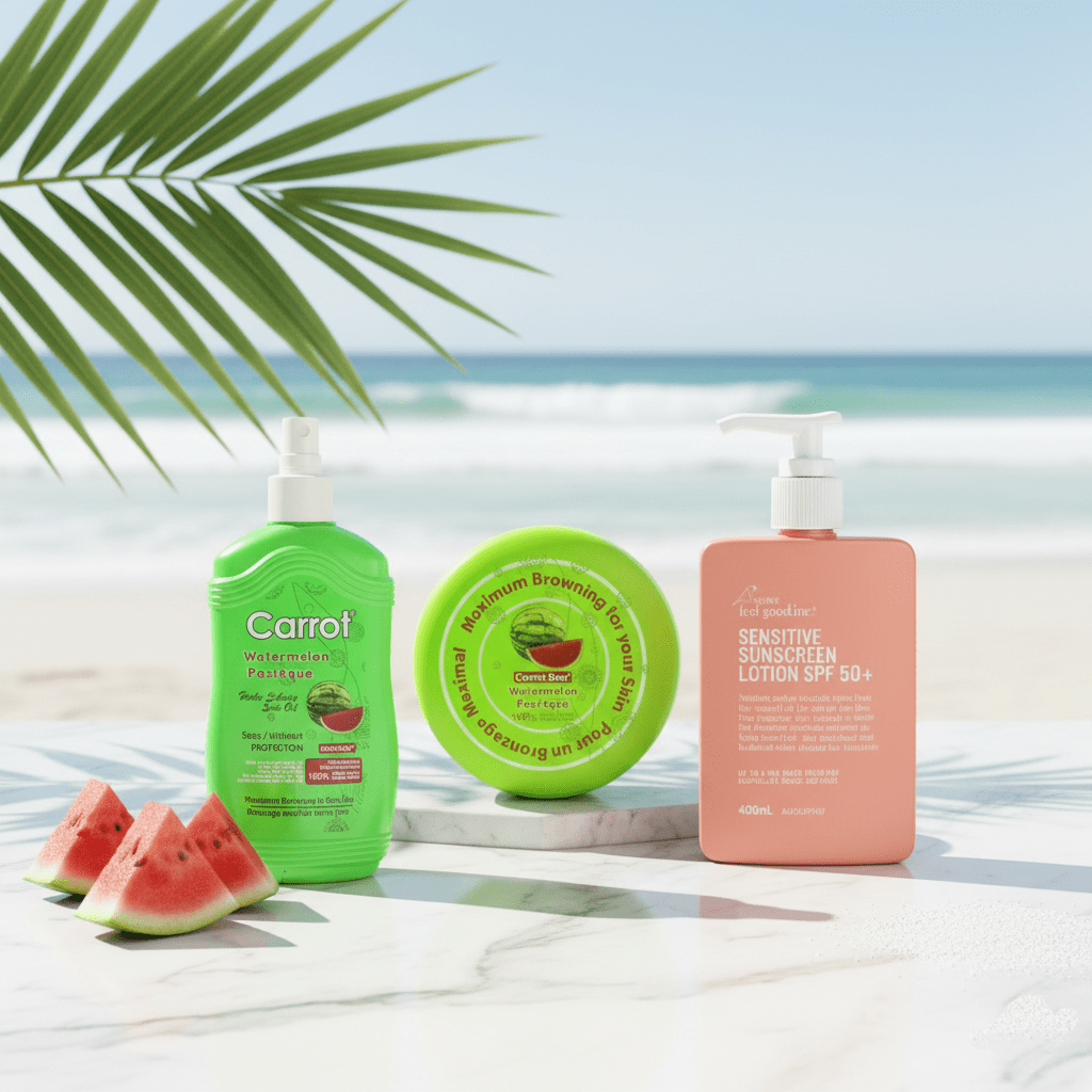 Spritz on our Carrot Sun Tan Accelerating Spray in Watermelon for a natural-looking tan in no time. This light, quick-dry formula has wheat germ oil, watermelon extract, carotene antioxidants, lycopene, and L-tyrosine to boost melanin production and hydrate and protect your skin from the sun.