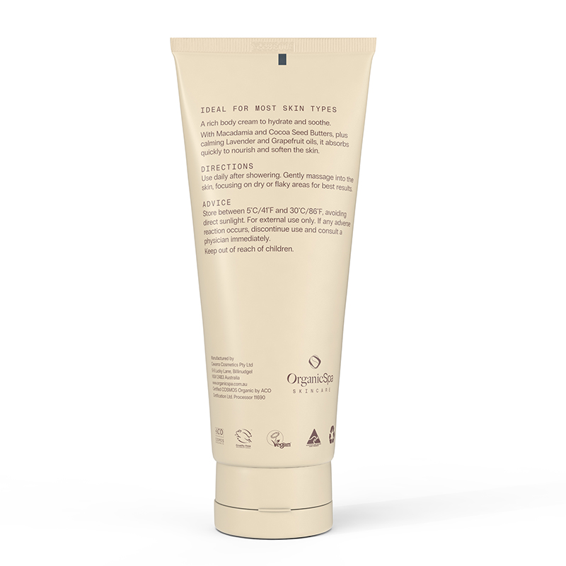 With Macadamia and Cocoa Seed Butters, plus calming Lavender and Grapefruit oils, it absorbs quickly to nourish and soften the skin.